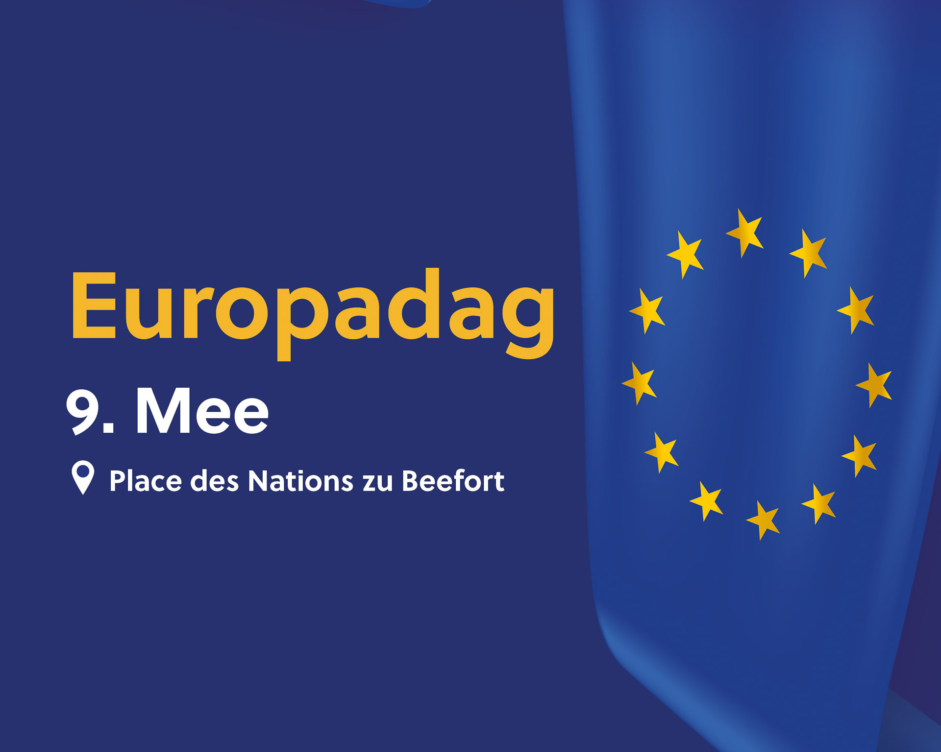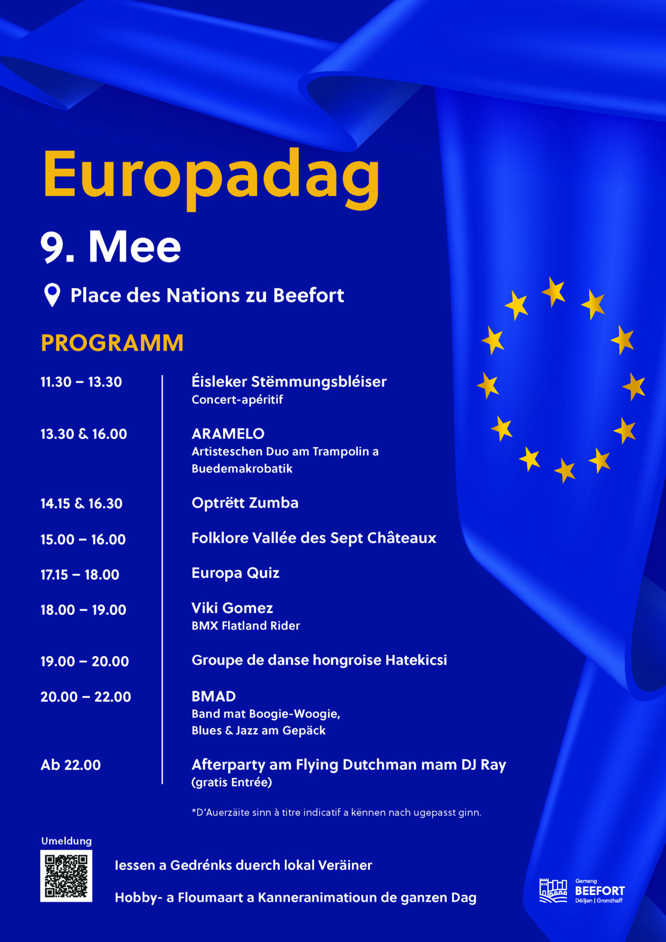 Gemeng Beefort organiséiert zesumme mat de Veräiner aus der Gemeng ee Fest zum Europadag e Samschdeg, den 9. Mee, ab 11.30 Auer. Den Detail vum Programm steet ënnendrënner an d’Umeldunge fir den Hobby- a Floumaart ginn iwwert dëse Link ugeholl oder iwwert de QR-Code an der Affiche.